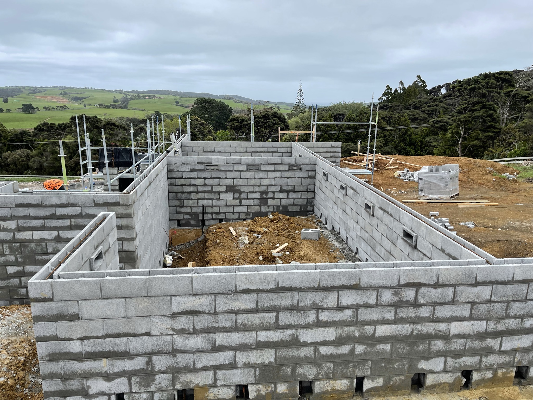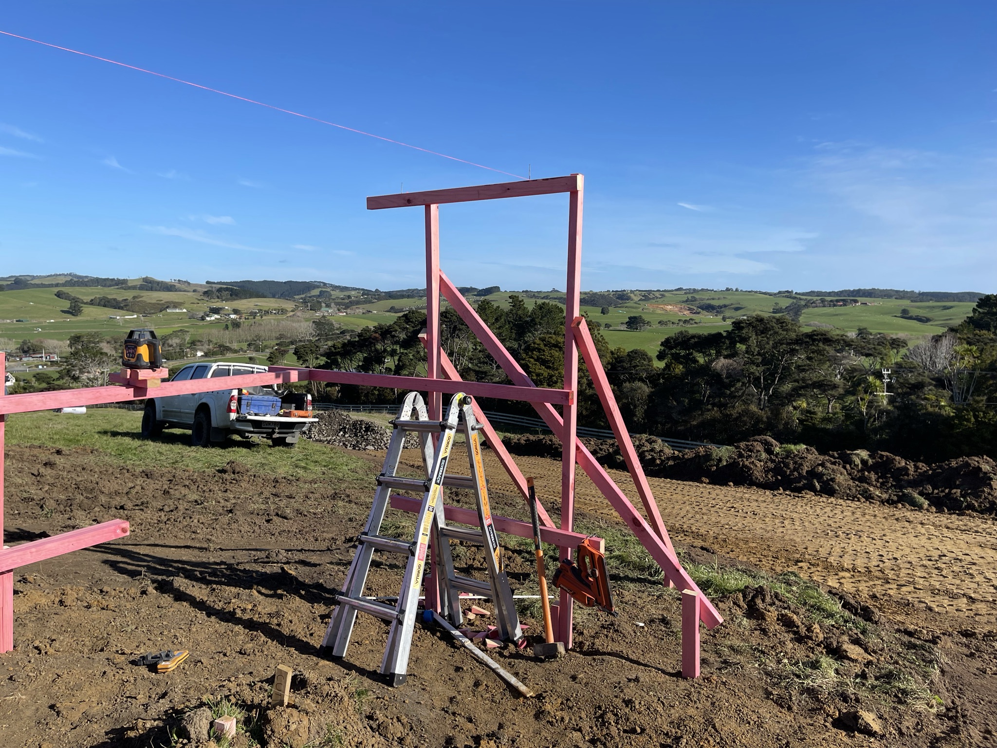 A building consent was issued. I was still hobbling a bit, but it was up to the land and sit around it for an afternoon, with some pegs and rope to actually look at the position. It didn’t feel right. And it wasn’t. Looking back at the original drawing and a penned outline I’d done on a scrap of paper using my phone compass the building had been swivelled away from the view. Not sure even now how that happened. But it did and it meant a new building consent and waiting until two weeks before the Auckland lockdown of August 2021 to start. Of course no one knew that the six week lockdown was coming, but it was a justifiable excuse for not meeting the December 2021 deadline for practical completion.